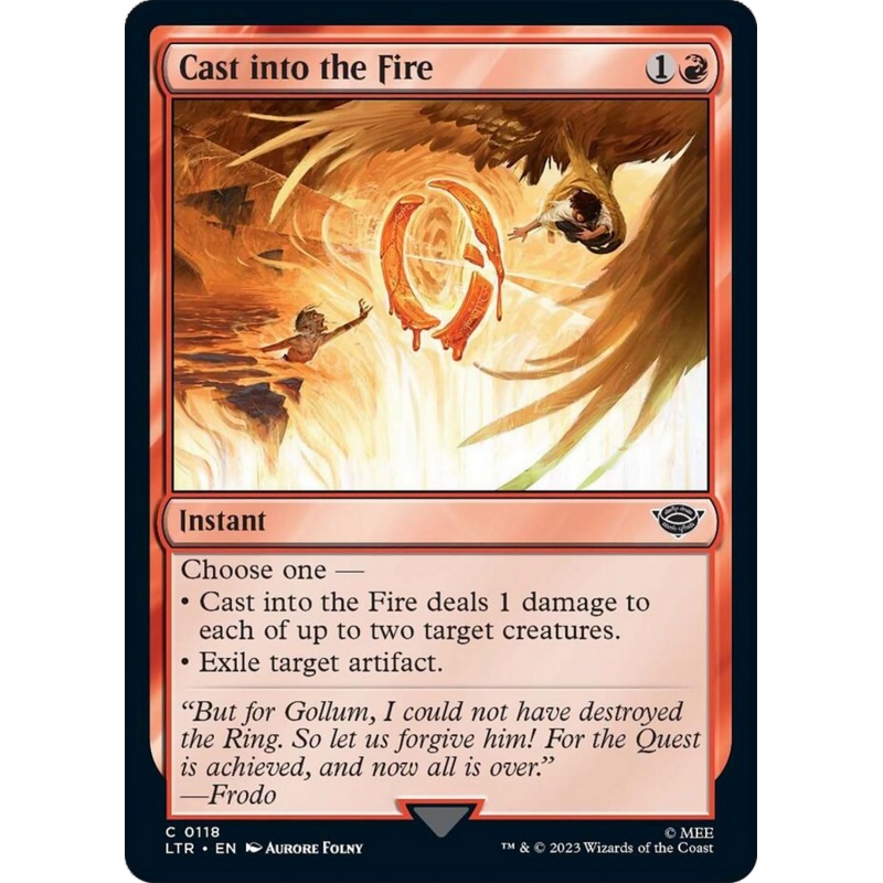 Set: The Lord of the Rings: Tales of Middle-Earth Type: Instant Rarity: Common Cost: {1}{R} Choose one Cast into the Fire deals 1 damage to each of up to two target creatures. Exile target artifact. But for Gollum, I could not have destroyed the Ring. So l