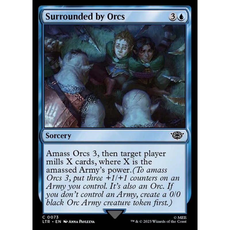 Set: The Lord of the Rings: Tales of Middle-Earth Type: Sorcery Rarity: Common Cost: {3}{U} Amass Orcs 3, then target player mills X cards, where X is the amassed Army's power. (To amass Orcs 3, put three +1/+1 counters on an Army you control. It's also an